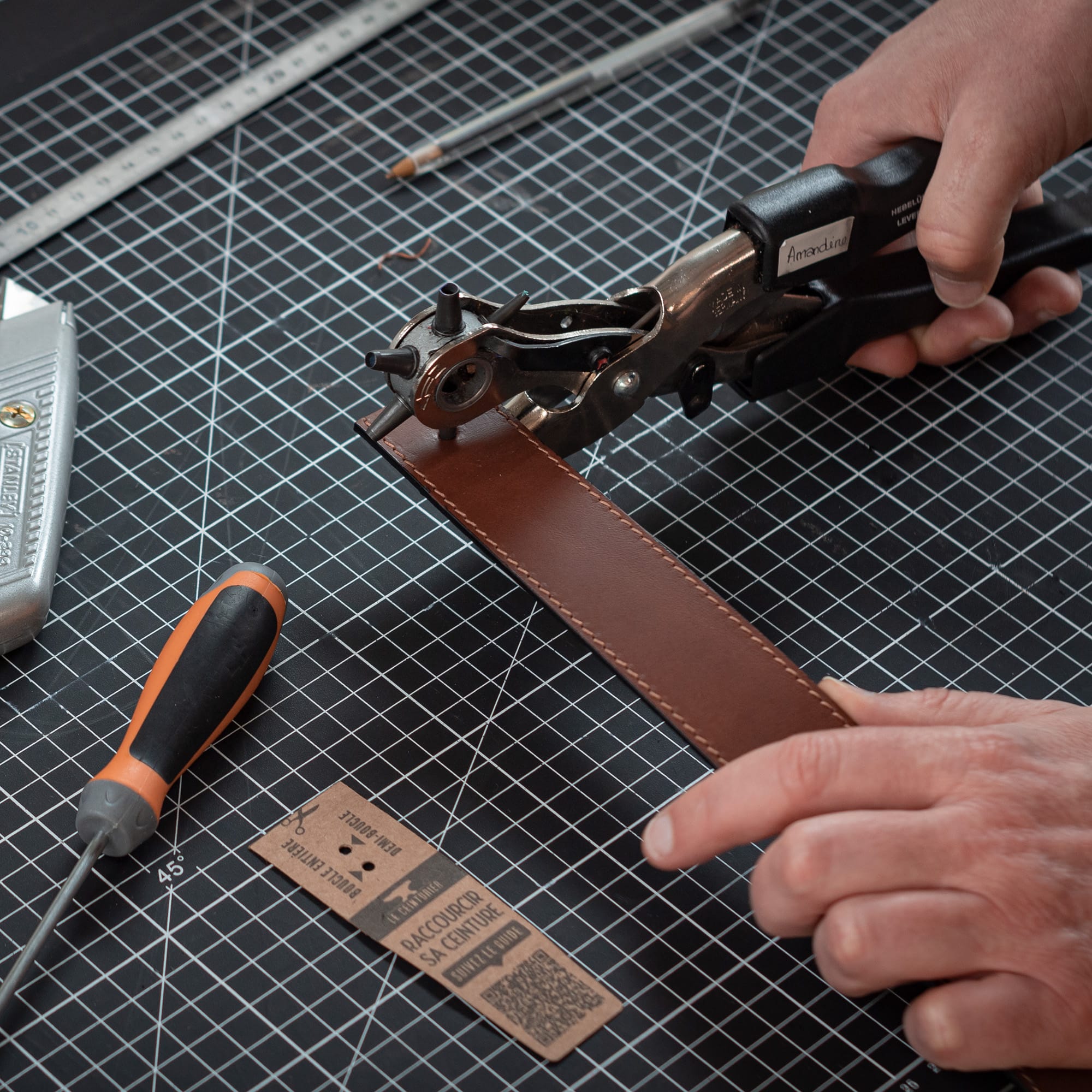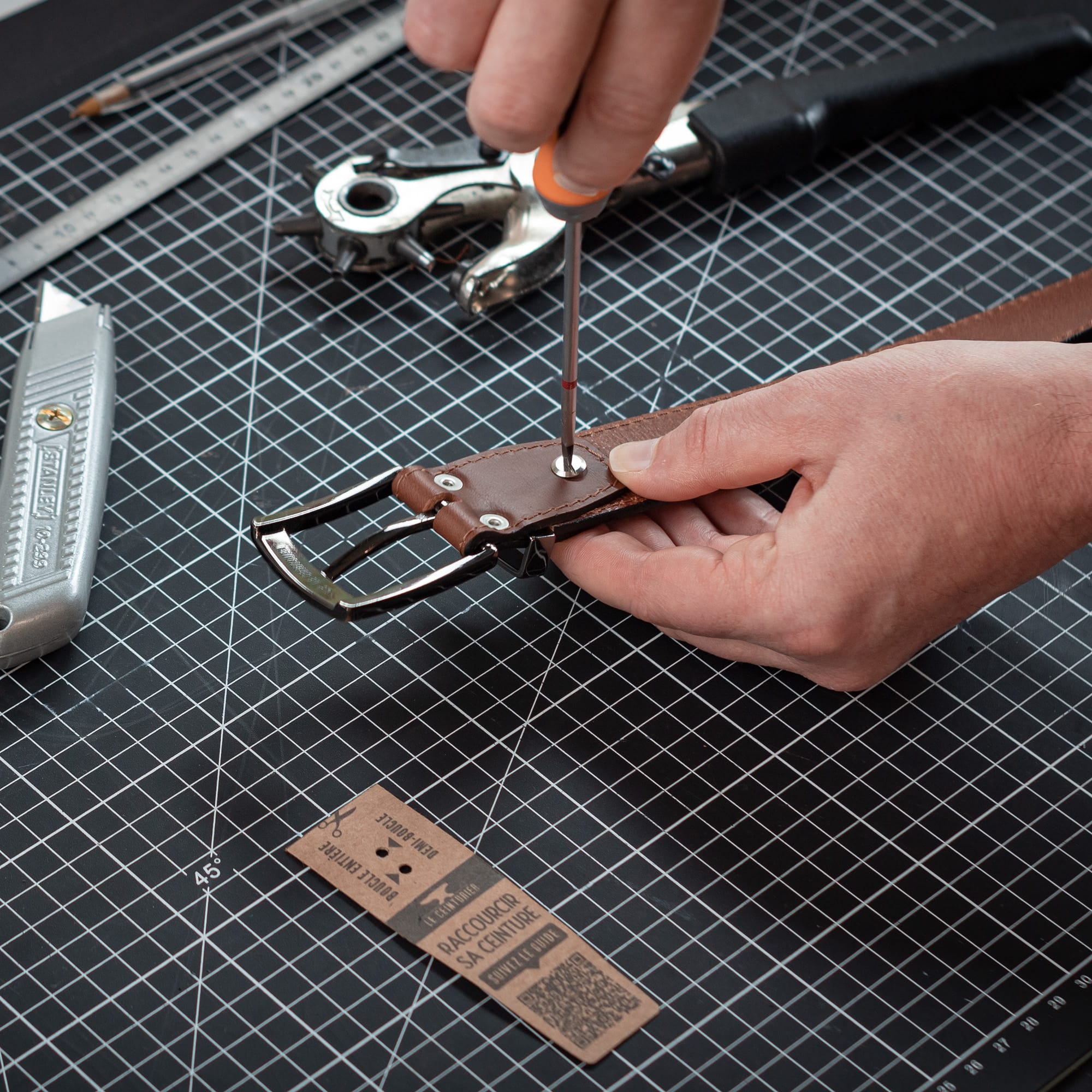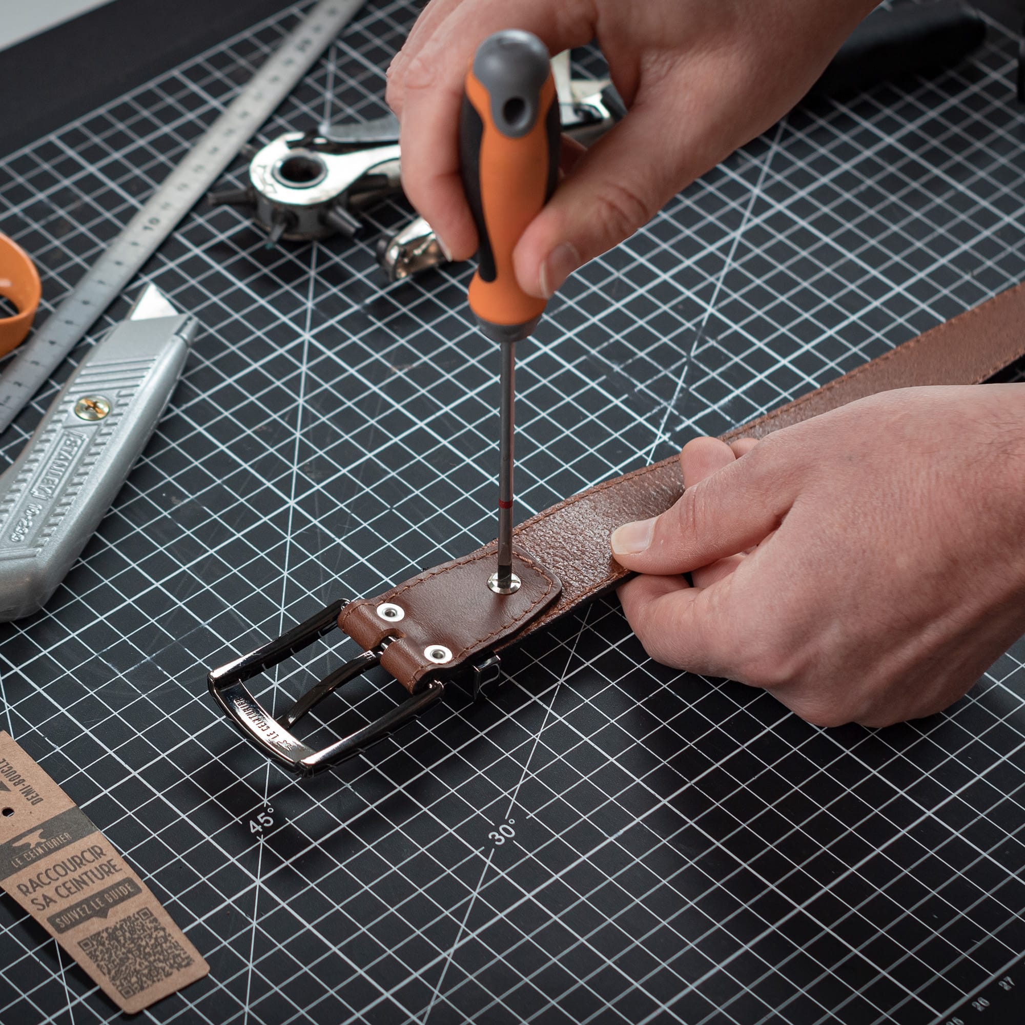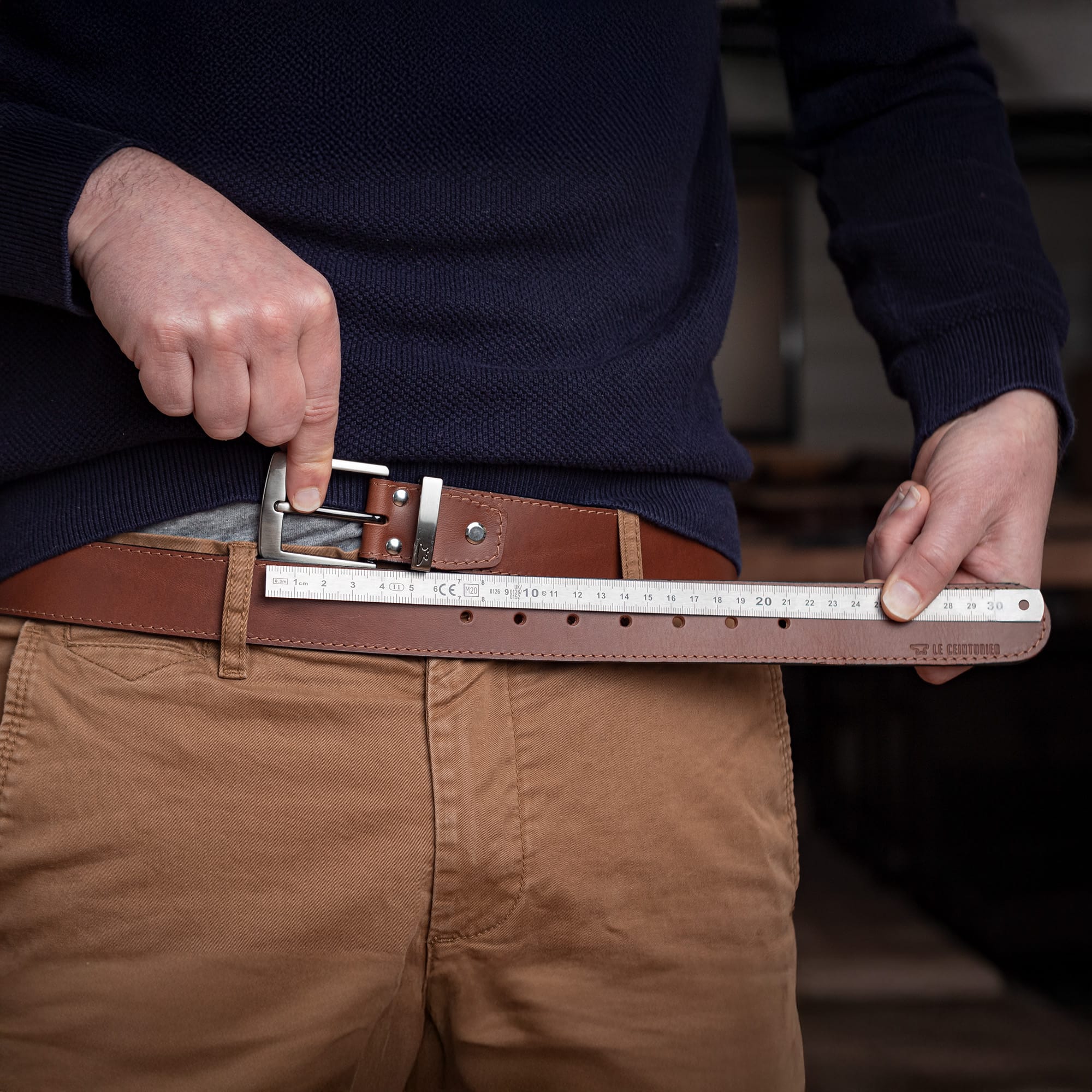 1. Je mesure de l'extrémité de la boucle jusqu’au trou central de ma ceinture afin de déterminer de combien la raccourcir.